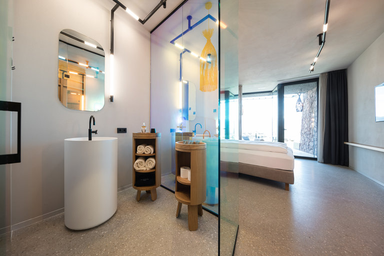 Tulle le suite sono dotate di una confortevole chaise longue perfettamente integrata nell’architettura, un incoraggiante invito a sdraiarvi, riposare o leggere un libro dando uno sguardo al panorama esterno.