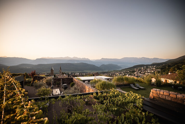 Dalle nostre suite è possibile ammirare un incantevole panorama. Grandi vetrate lasciano ampio spazio alla vista, dalle Dolomiti fino al Lago di Caldaro.